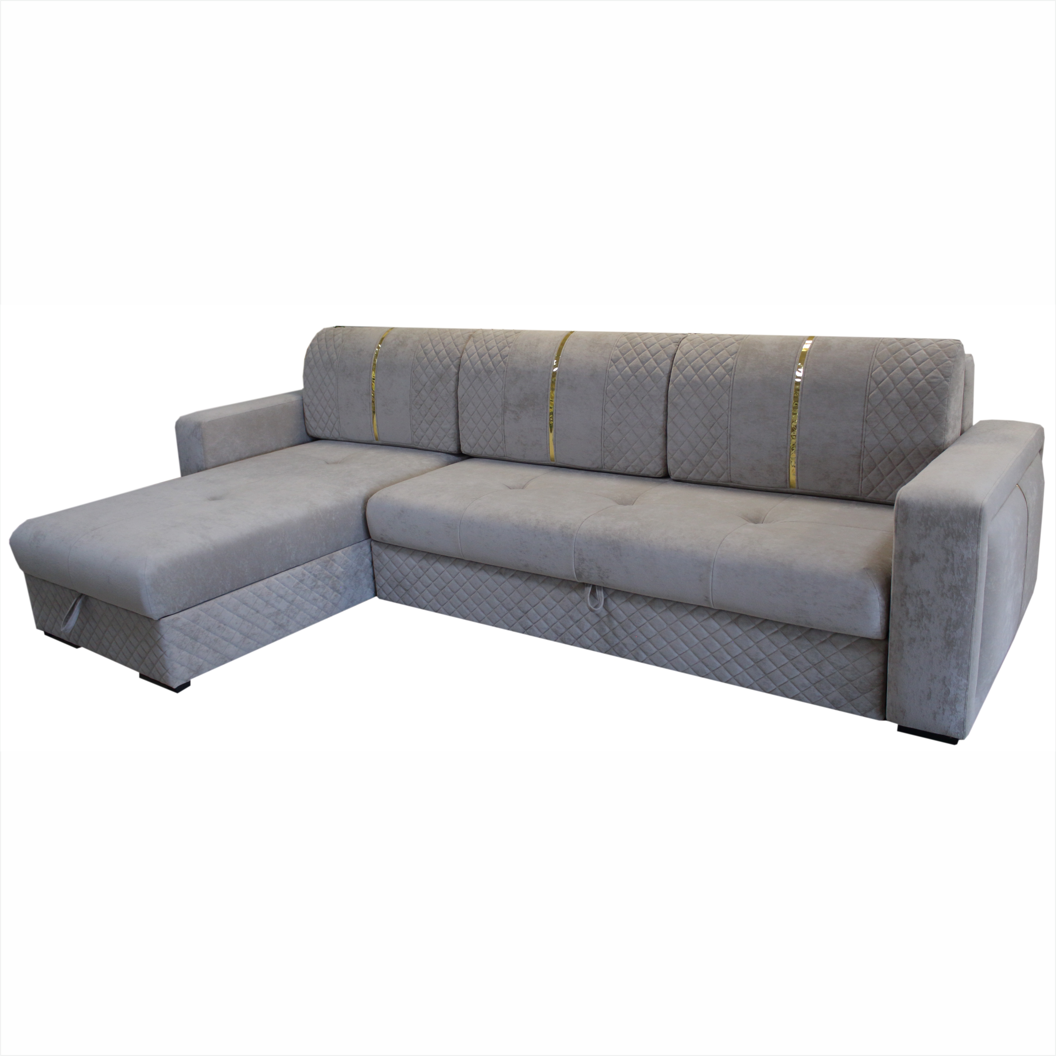 Диван угловой «Эдисон» имеет внушительные габариты. Массивная и роскошная модель станет прекрасным вариантом для оформления гостиной как в современном, так и классическом стиле. Царги и подушки украшены декоративной стежкой . Отделка подушек спинки и боковин металлизированной эко/кожей придает модели изысканный вид. Механизм «Еврокнижка» на металлокаркасе дает возможность в считанные минуты трансформировать диван в удобную двуспальную кровать. Механизм долговечный и подходит для ежедневной эксплуатации. В диване и оттоманке имеются места для хранения.