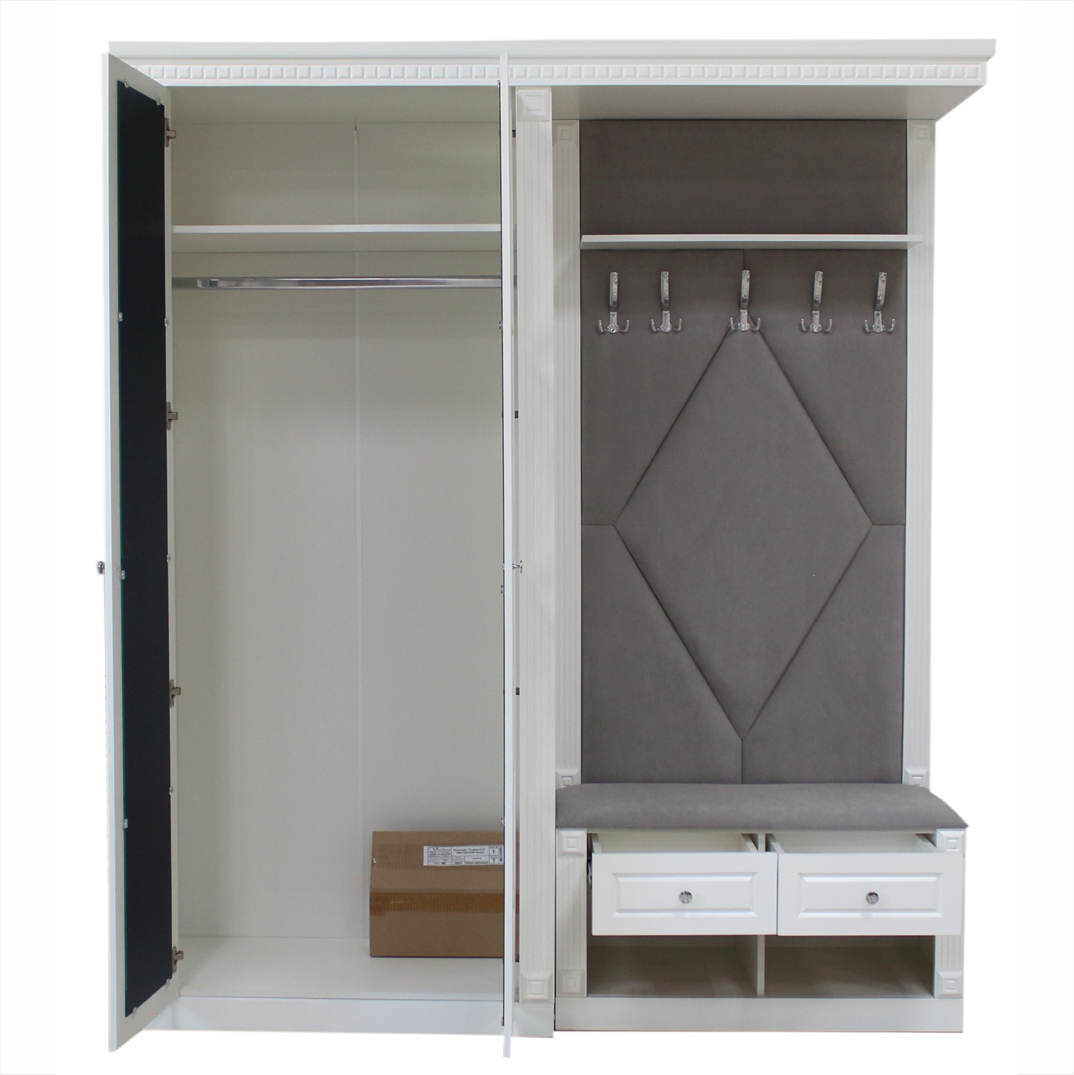 Прихожая "Сорренто-2" Фасады: МДФ крашенное, зеркало Корпус: ЛДСП Габариты: 1964*500*2240 мм Обивка: велюр серый Цвет корпуса: белый