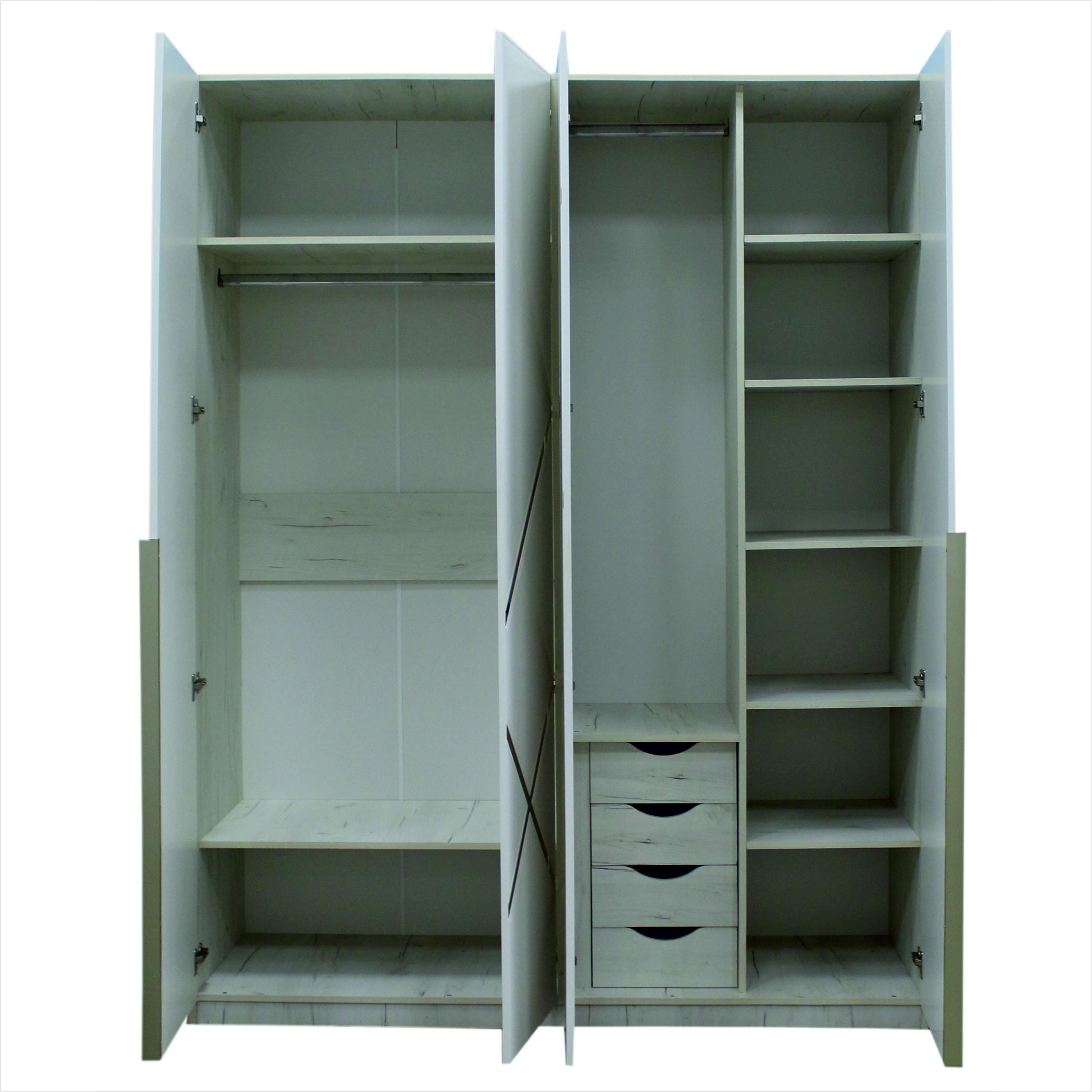 Шкаф "Престиж" 4-х дверный Материал: ЛДСП Размеры: 1700*520*2166 мм Цвет: дуб крафт белый+бланж матовый с золотым молдингом